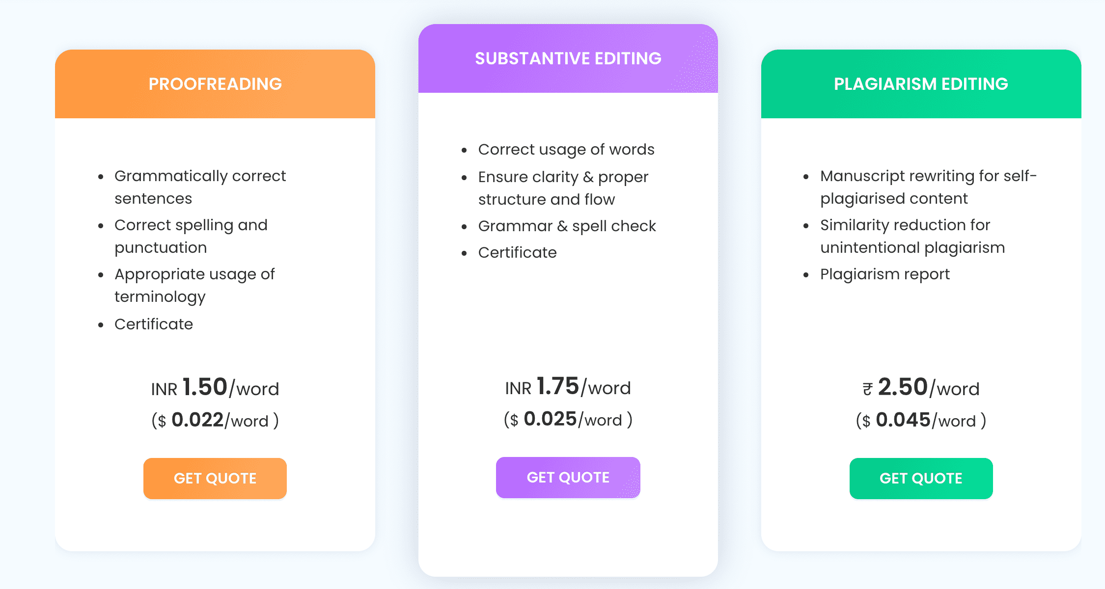 At ContentConcepts, we offer discounts to academic institutions such as universities, colleges and research centres. When you send your manuscript, please send it through your departments and get the discount. The discount is offered on our proofreading and manuscript editing services. Please check our pricing below