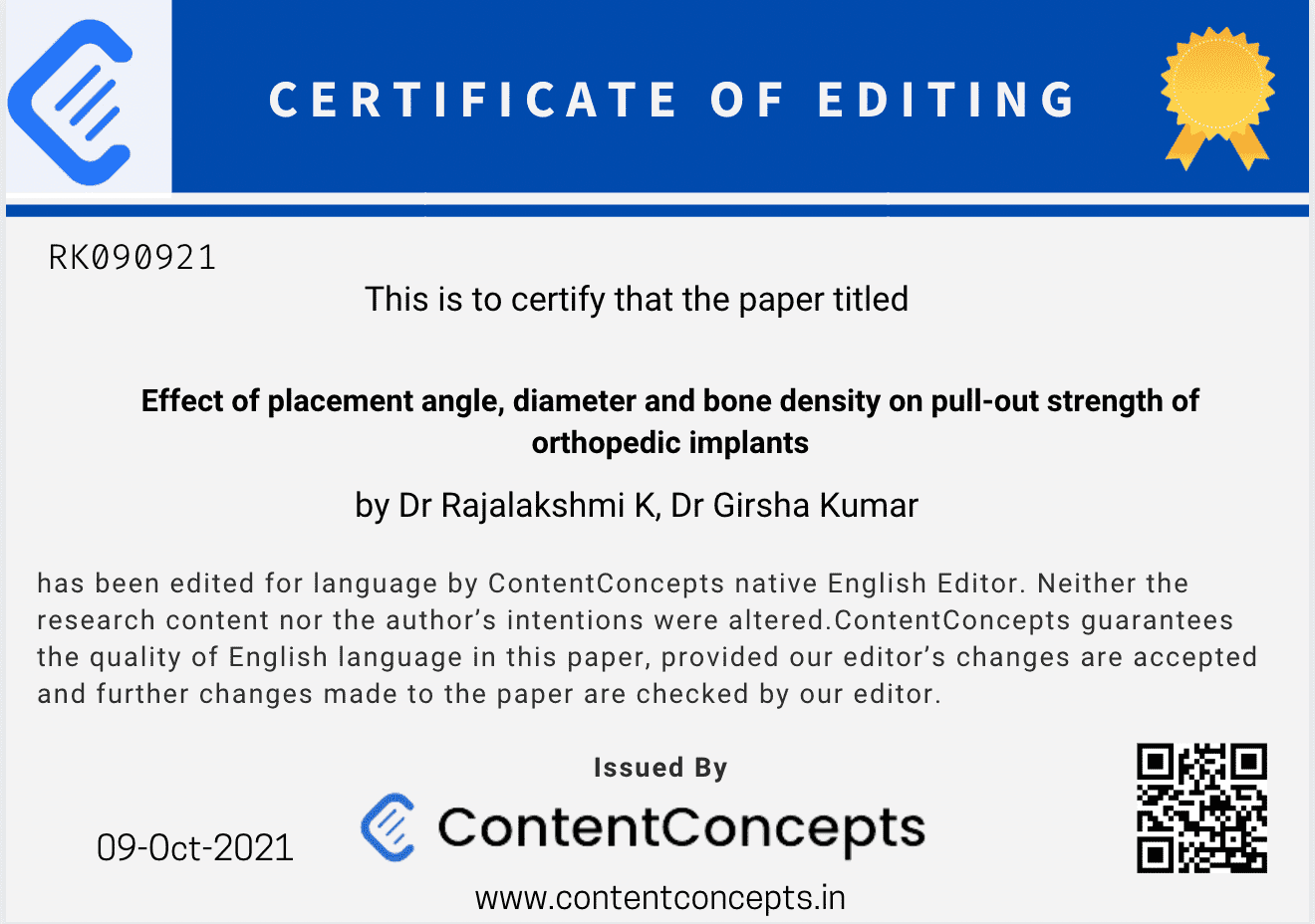 When you submit your manuscript to us for manuscript editing, or English editing you can get a free English editing certificate. Check the Editing Certificate sample below
